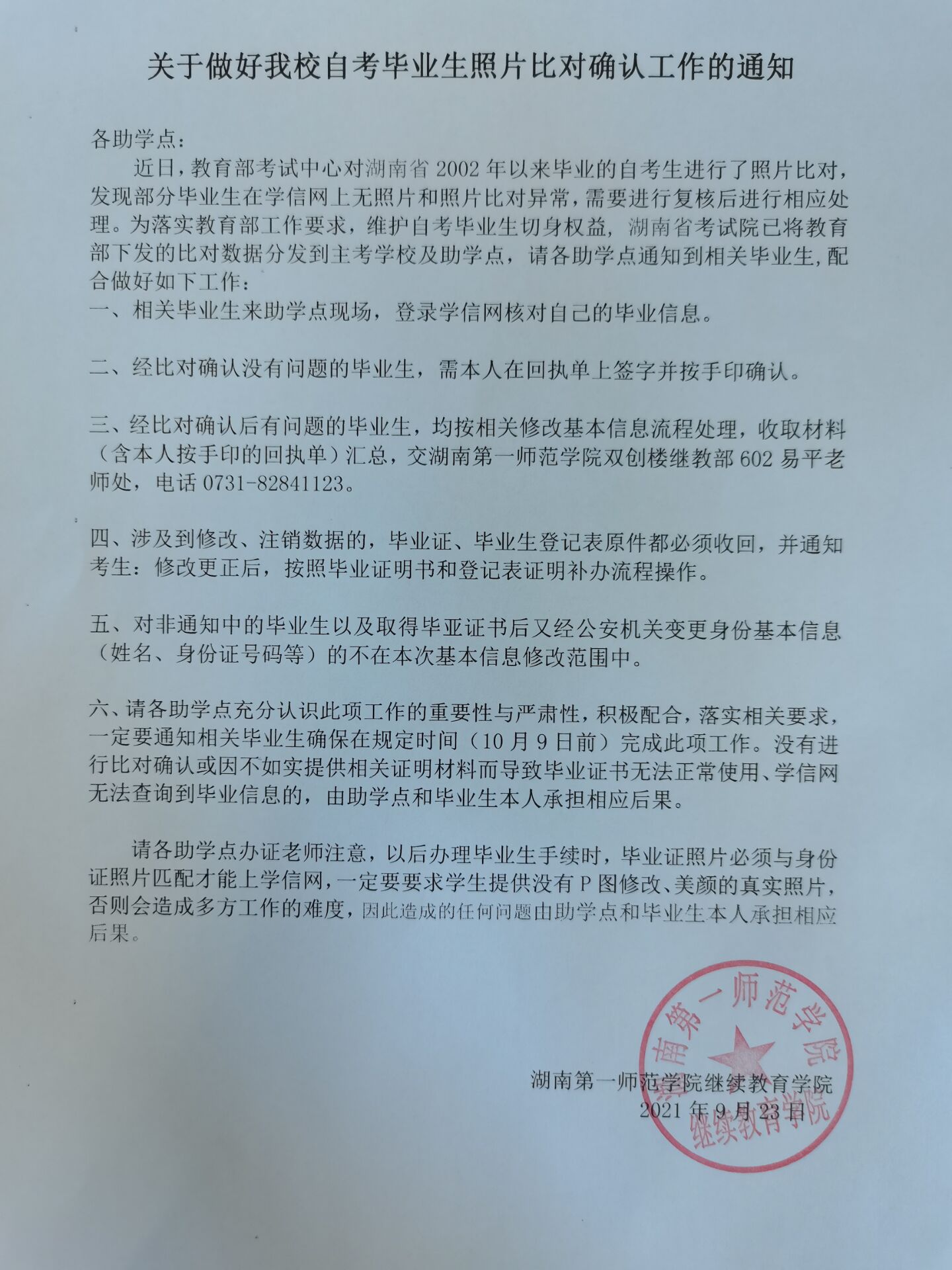 六、请各助学点充分认识此项工作的重要性与严肃性,积极配合,落实相关要求,一定要通知相关毕业生确保在规定时间(10月9日前)完成此项工作。没有进行比对确认或因不如实提供相关证明材料而导致毕业证书无法正常使用、学信网无法查询到毕业信息的,由助学点和毕业生本人承担相应后果。
