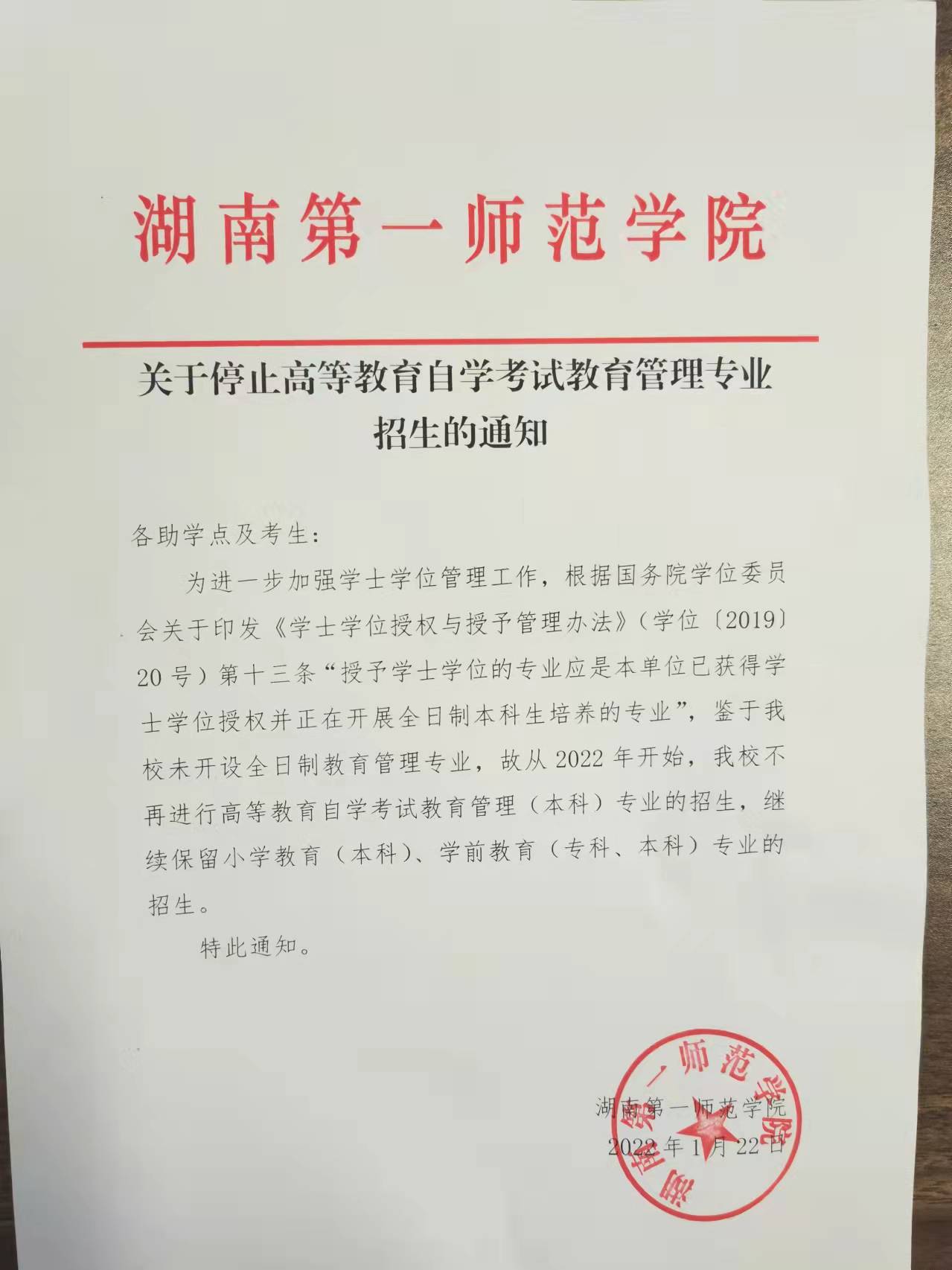 关于公司高等教育自学考试教育管理专业停止招生的通知