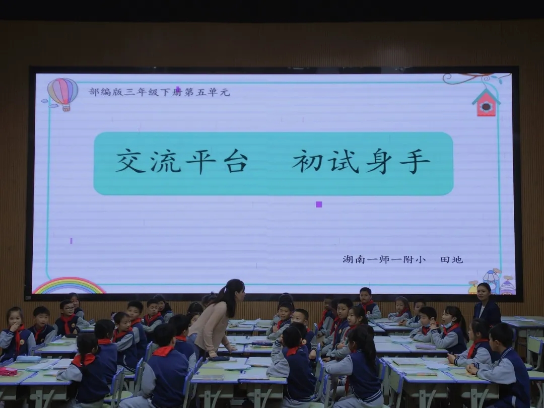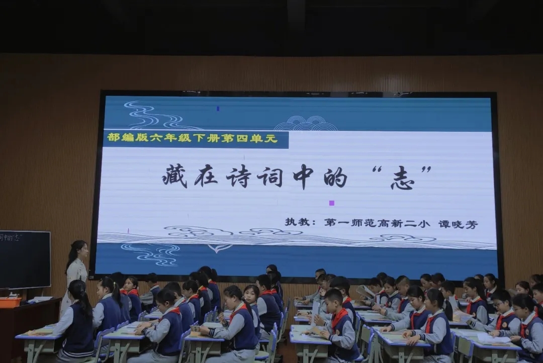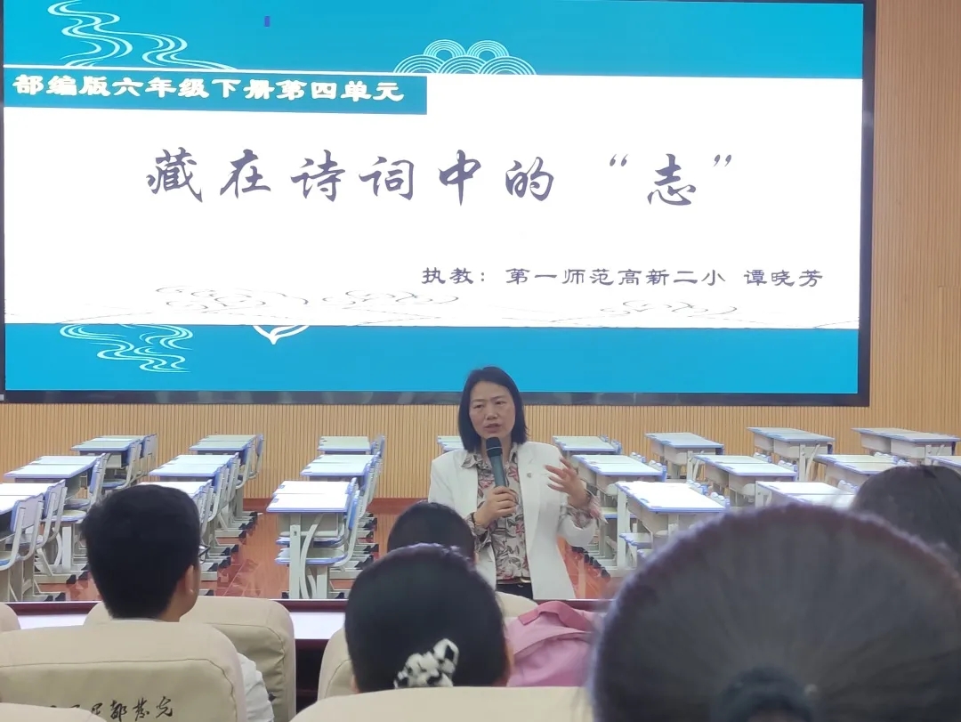 《交流平台 初试身手》由来自一师一附小的小学语文教学名师田地执教,《藏在诗词中的“志”》则是由一师高新二小名师谭晓芳主讲。