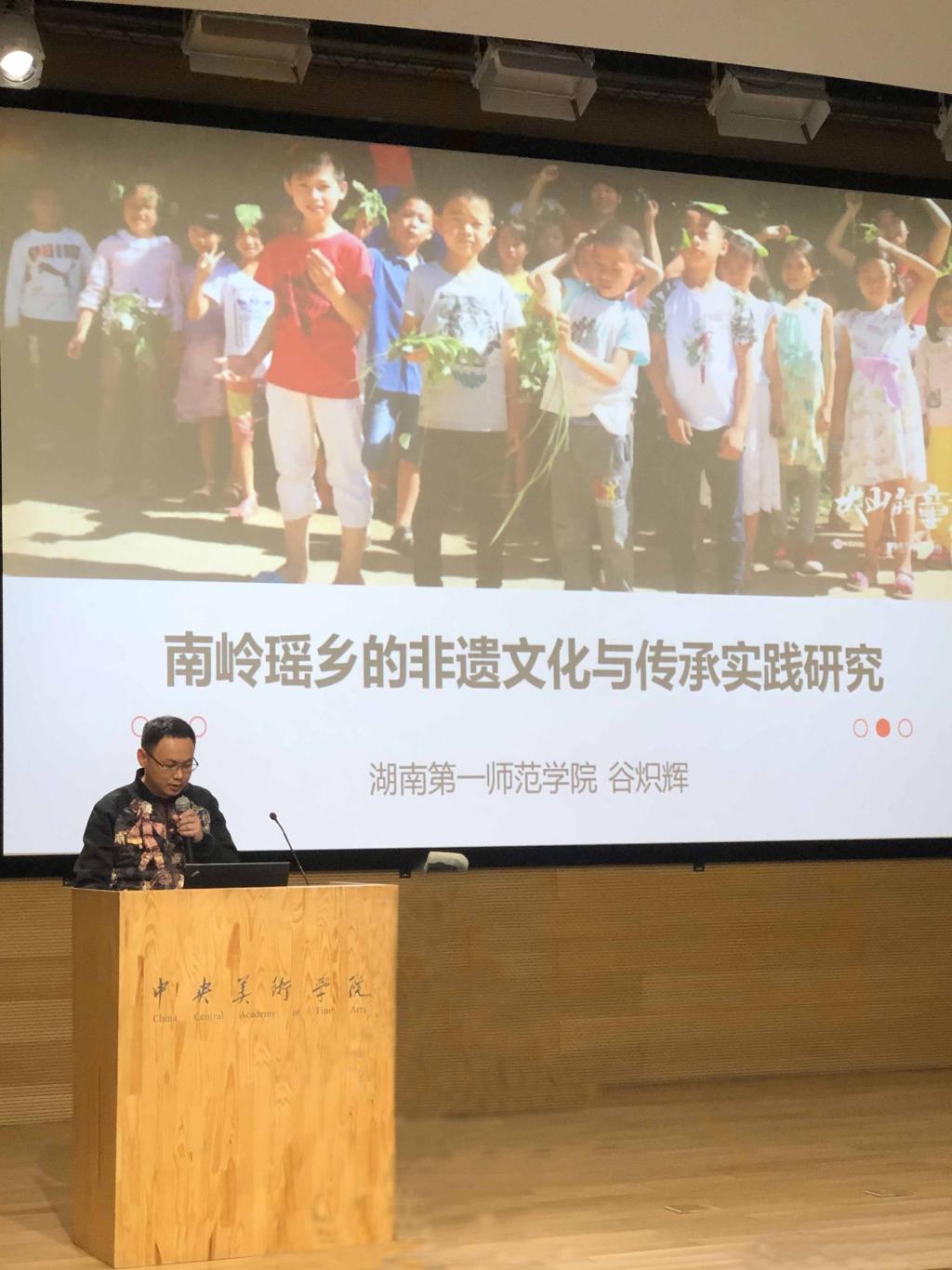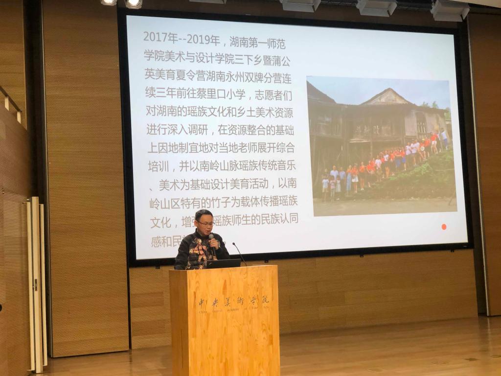 谷炽辉老师介绍导师工作坊工作成果并进行“南岭瑶乡的非遗文化与传承实践研究”主题演讲。主题演讲汇报了美术与设计公司持续三年在湖南省双牌县蔡里口小学开展的美育夏令营的工作情况,从用教育的方法促进瑶族文化在瑶族农村地区的传承和发展、将瑶族民间文化引入美术课堂和寻找资源为我所用、扩大活动影响力三个方面展开,最后提出因为美育夏令营等各方面的共同努力,一所湖南和广西交界的偏远村小在2019年9月10日获得了国家教育部“全国教育系统先进集体”的荣誉称号,引起了与会者的广泛兴趣,得到了他们的高度赞誉。他们一致认为,美育夏令营很有成效,向孩子们传承了丰富的民间美术知识,促进了教育公平,为基层乡村教师培训了美育能力,提升了校园环境,南岭瑶乡的非遗文化得到了较好的保护和传承。